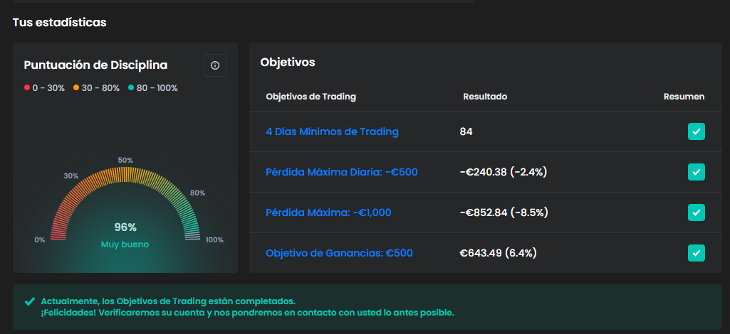 Esto confirma que se han alcanzado todos los objetivos establecidos dentro del proceso de evaluación y que la cuenta está lista para operar como cuenta fondeada.