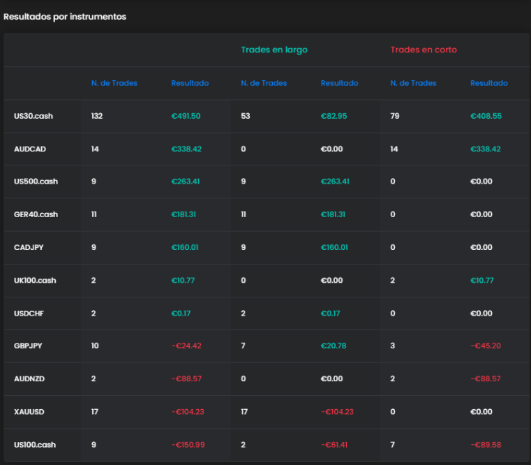 En esta fase he operado 11 instrumentos diferentes, con mejores resultados en US30.cash, AUDCAD y US500.cash.